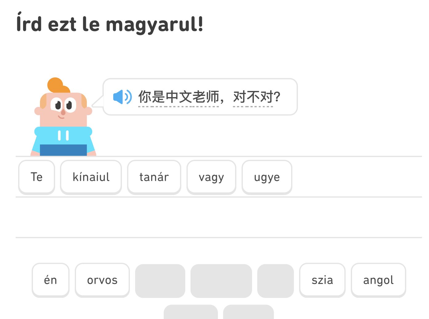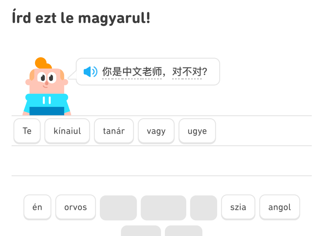 Another feature of Hungarian is often neglected when the free word order is punished at various places. Although the Chinese phrase for ‘is that right/correct’, i.e. 对不对 is placed at the end of a question, in Hungarian, we often put it close to the beginning, like in ‘Te ugye nem gyakran mész étterembe?’. Similarly, ‘Ugye nem mész gyakran étterembe?’ is just as normal, the place of ‘often’ and the negative being mostly interchangeable. Except that we would usually ask, ‘Ugye nem jársz gyakran étterembe?’, if at all. Also, the personal pronouns are mostly left out, like in Russian – thankfully, this is not punished by the course.
